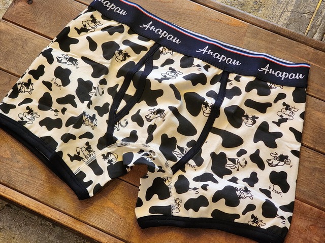 牛柄に、3匹のウシを放牧しました。 こちらは前開きタイプのボクサーパンツです。 ※クリックポストでの配送は2点までとさせていただきます。 MADE IN JAPAN 綿95% ポリウレタン5% 肌触りが良く伸縮性に優れたコットンベア天竺を使用。 股部にはフラットシーマで縫製してるので履き心地抜群です。 サイズ:M ウエスト 74〜86cm L ウエスト 84〜96cm 〜anapau アナパウ〜 毎日身に着けたくなるアンダーウェアをコンセプトに、 高品質な JAPAN MADE にだけ拘り生産しています。 そこに少しの遊び心のエッセンスを加えた アンダーウェアブランドです。