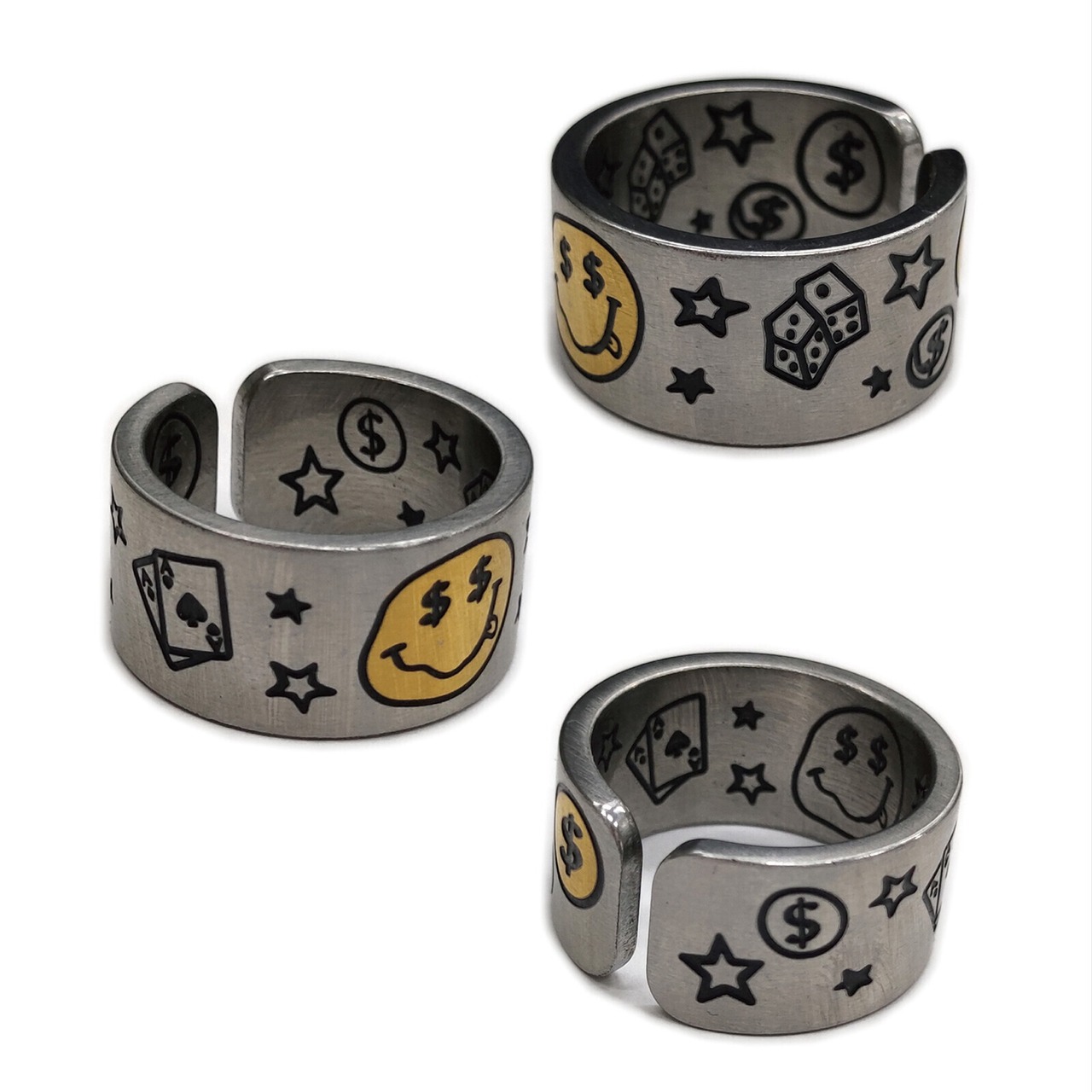 ドルマークやサイコロ、トランプなどギャンブルを連想させる遊び心あふれるデザインモチーフをリングの表と裏に配置。