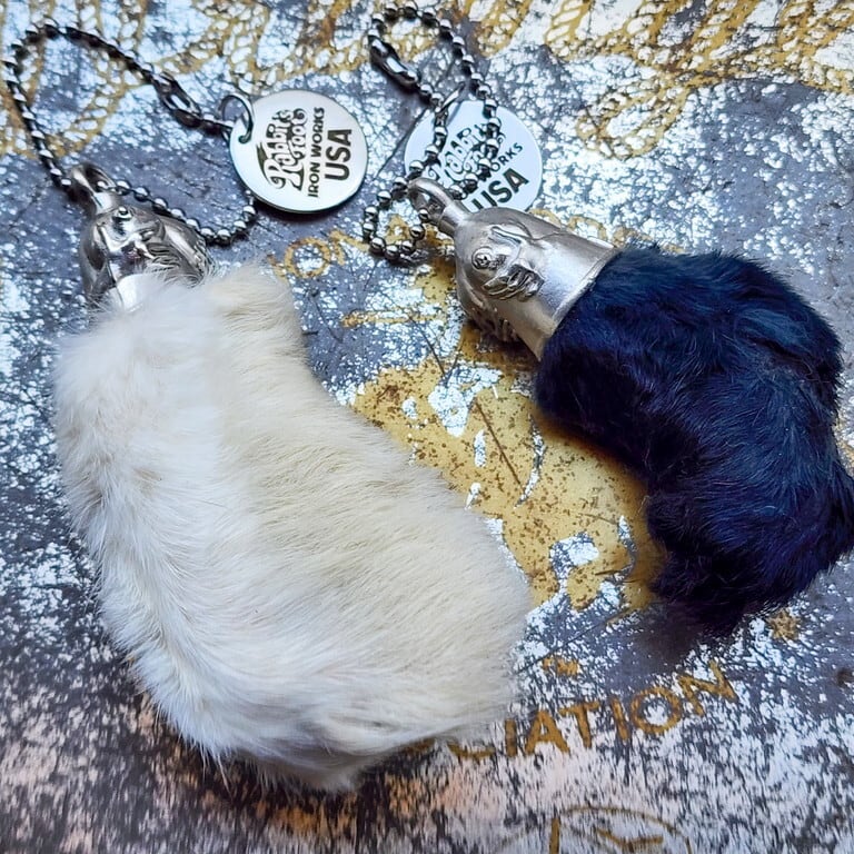 セクシーな止め具をかぶせたラッキーラビットフットです。不思議な力が宿るとされる“ウサギの後ろ足(足先)”に留め具を取り付けお守りとして加工したキーチェーンです。アメリカやイギリス、メキシコなどで人気が高く、1940年代 - 1960年代にアメリカのヒッチハイカーやバイカーたちの間で流行したお守りです。