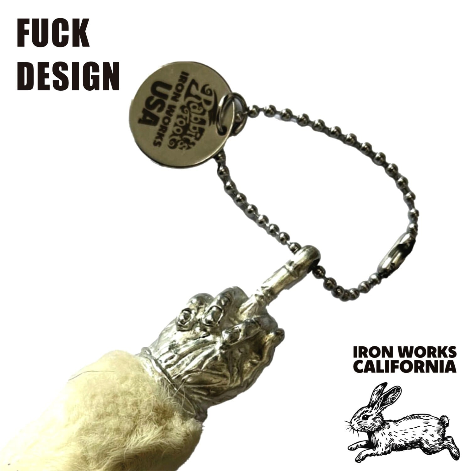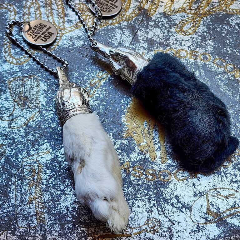 中指を立てたアウトローな止め具をかぶせたラッキーラビットフットです。不思議な力が宿るとされる“ウサギの後ろ足(足先)”に留め具を取り付けお守りとして加工したキーチェーンです。アメリカやイギリス、メキシコなどで人気が高く、1940年代 - 1960年代にアメリカのヒッチハイカーやバイカーたちの間で流行したお守りです。