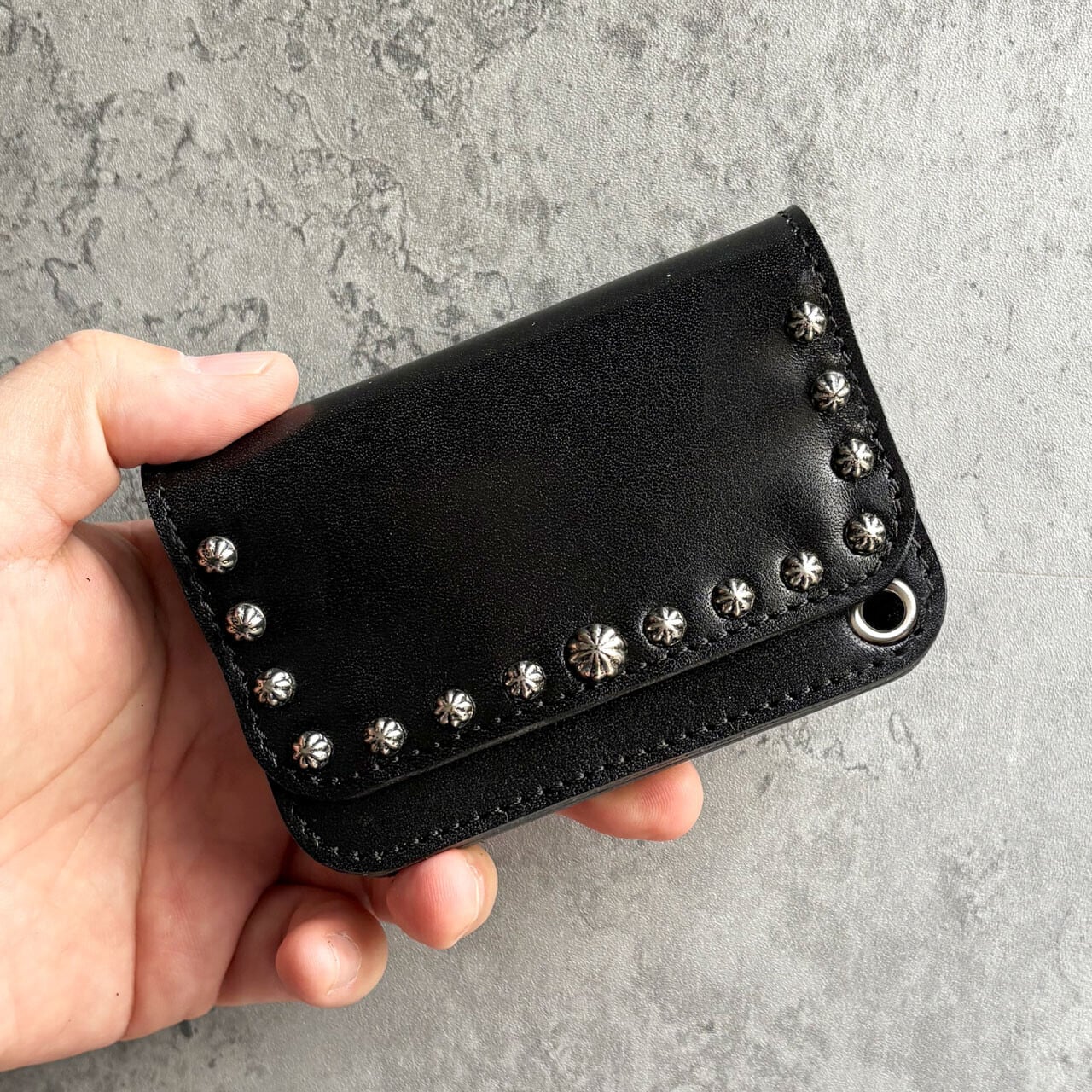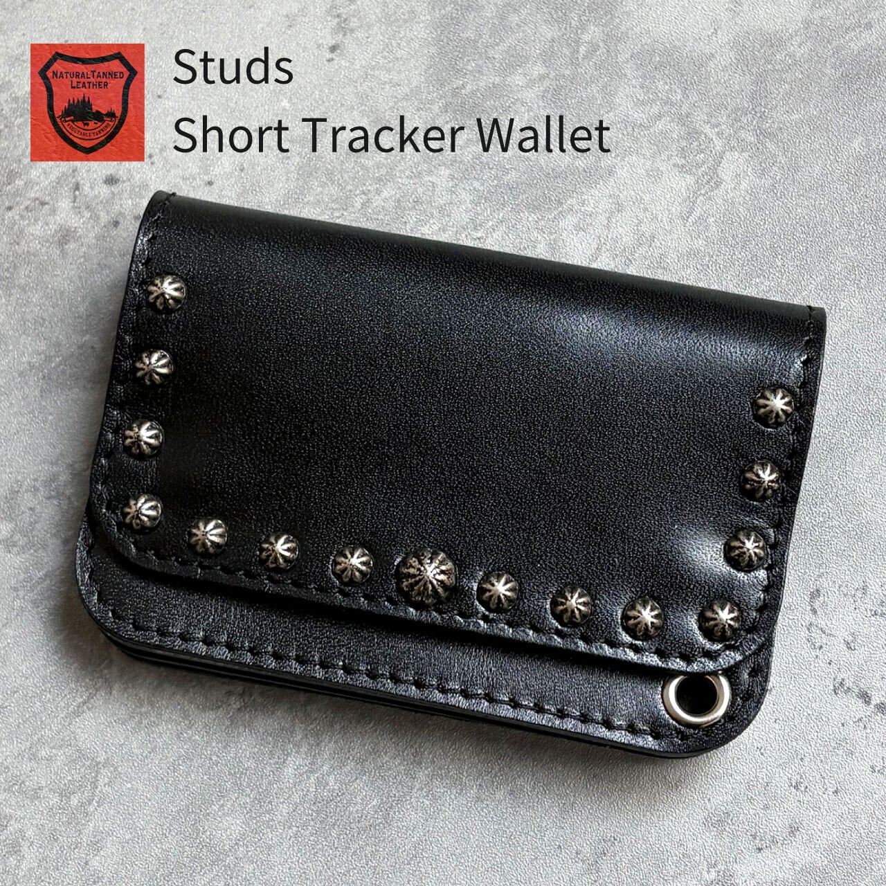 栃木レザーを使用した、コンパクトなトラッカーウォレットにアメリカ製の真鍮スタッズでカスタムされています。