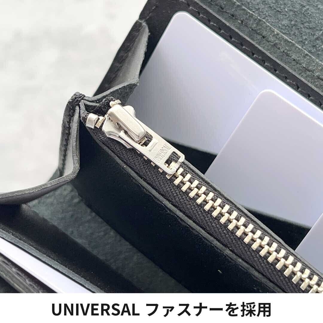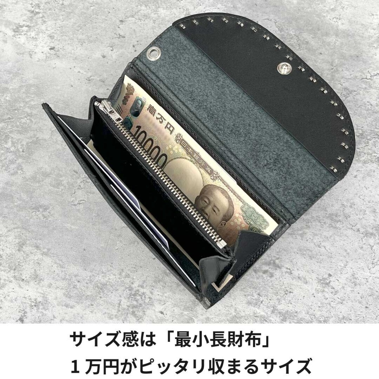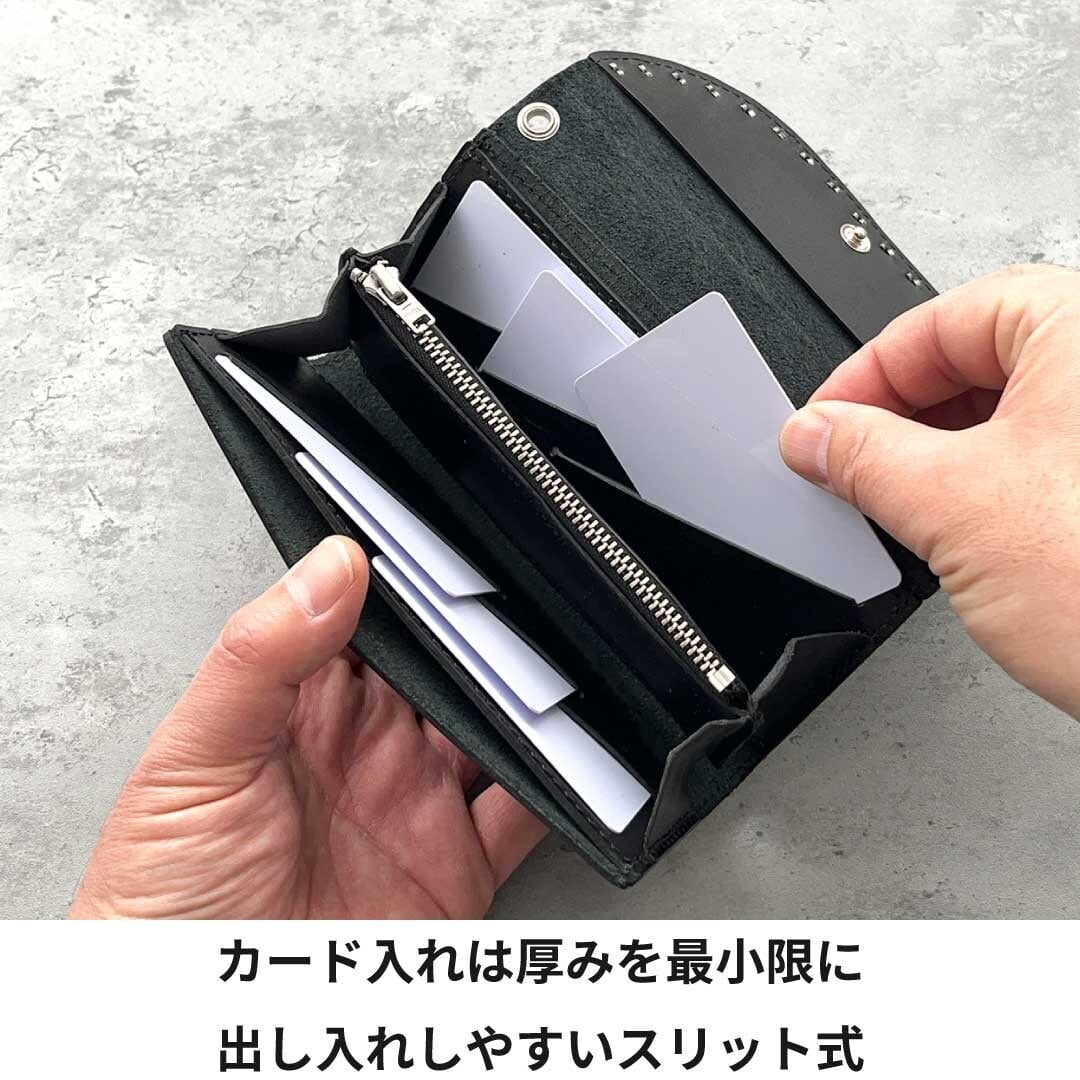 長財布でありながら1万円がピッタリ収まる最小サイズに仕上げています。カード入れは折り重なる部分を無くし、スリット式にすることで厚みを最小限に抑えています。