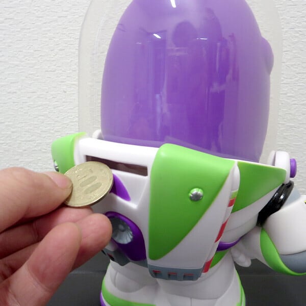 From the familiar space suit and dome helmet to the colorful control panel on the chest, the classic Buzz look is nicely reproduced in this display-worthy bank.